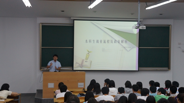 为推进天博体育 2013届毕业生就业指导工作的开展,让学生了解就业流程及政策,缓解毕业学生在面对严峻就业形势时的紧张情绪,鼓励学生以积极的心态面对职场的考验,天博体育 于9月9日晚20:30在教学楼3D209召开了本科生就业动员大会,天博体育 毕业班辅导员刘建老师、范晓云老师以及2013届毕业生参加了本次大会。刘建老师为大家做了关于就业流程与政策的讲座。