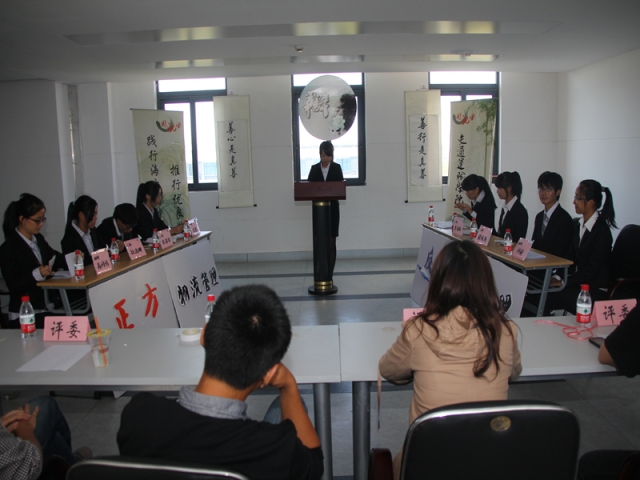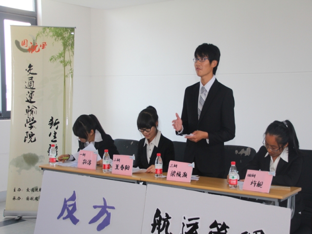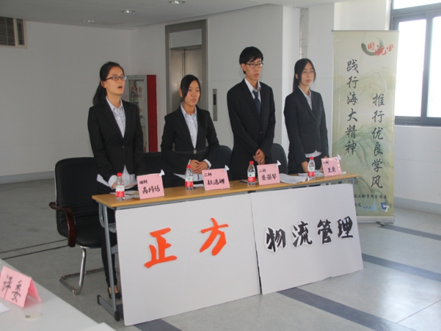 首场辩论比赛便十分激烈,由正方物流管理辩论队对阵反方国际航运管理辩论队。正方的立论旁征博引,而反方则举例生动鲜活,一开始双方旗鼓相当。然而在攻辩环节中,正方辩手们一连串提问十分犀利,让反方选手措手不及。正方选手在自由辩论时一度令反方哑口无言。双方的总结各具特点,均全面地总结了对方的观点并严谨的对我方的观点进行阐述,反方层层递进极富逻辑性,而正方注重问题的全面性。最终,第一场辩论赛以正方即物流管理辩论队获得胜利。