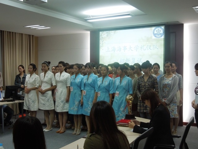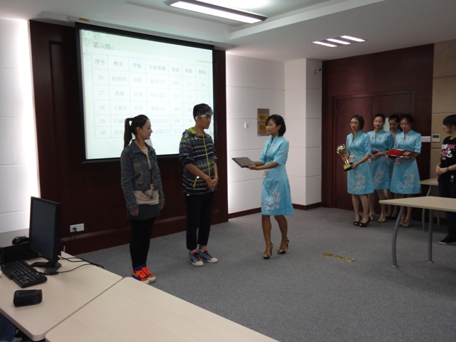 本次复试均要求学生在前期完成化妆、盘头等基本准备工作,着礼仪队旗袍依次进行面试,面试分为自我介绍和情景模拟两个环节。通过同学们的自我介绍和对礼仪队工作的看法,了解学生的谈吐和文化素养。情景模拟分为迎宾和颁奖两个场景,从站姿、走姿几个动作对学生的形体进行严格筛选。最终在几位评委老师的认真筛选下,选拔出15名同学进入礼仪队,我们也将在后期对新进同学进行专业培训。