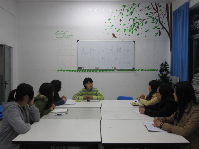 11月14日晚上, 50-51号楼自管会在楼内办公室召开了主题为"弘扬十八大精神"的专题研讨会,社区自管会辅导员陈祯如老师,各部长以及党员督导队出席了此次会议。