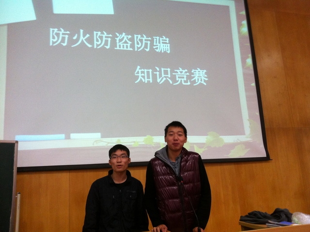 2012年11月21日星期三,56-57社区管理委员会的同学们在教学区举办了一次“防火防盗防骗”主义知识竞赛,本次活动得到了老师和同学们的大力支持和认可。