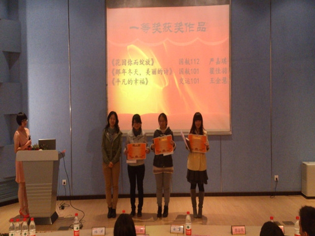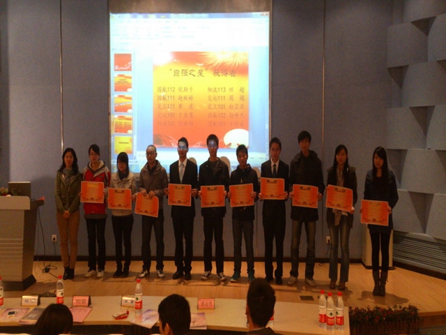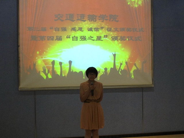 颁奖仪式开始时由赵睿老师致开场辞,简要总结了2011—2012学年天博体育 的资助工作,并结合自身奋斗历程对十位自强之星及参加颁奖仪式的2012级家庭经济困难学生给予了充分的鼓励;征文比赛的颁奖仪式在一等奖作品“花因你而绽放”深情的选段朗诵中拉开序幕,颁奖仪式采用由交运天博体育 第一、二届自强之星宣读征文评语即颁奖词的方式向征文获奖同学颁发了征文合集及荣誉证书;随后赵睿老师宣读了天博体育 第四届 “自强之星”的获奖者名单,其中来自四个不同专业的“自强之星”代表采用PPT演讲的方式展示了他们在大学期间的生活学习感悟,蜕变得更加自信的他们都用自己的自强之心写出了各自的精彩和一份感恩的心。