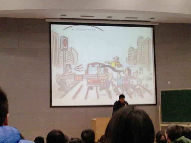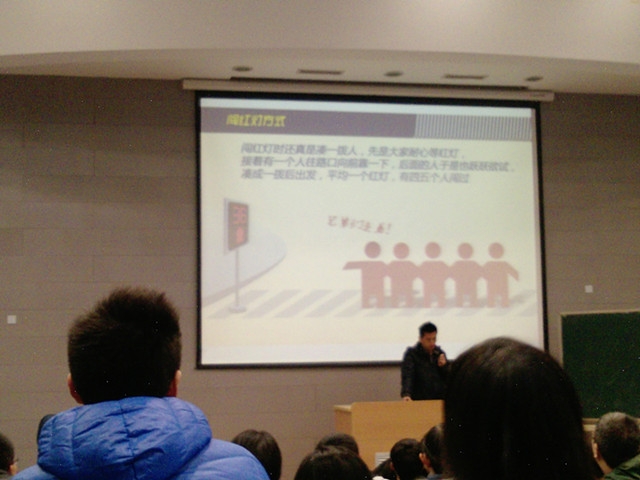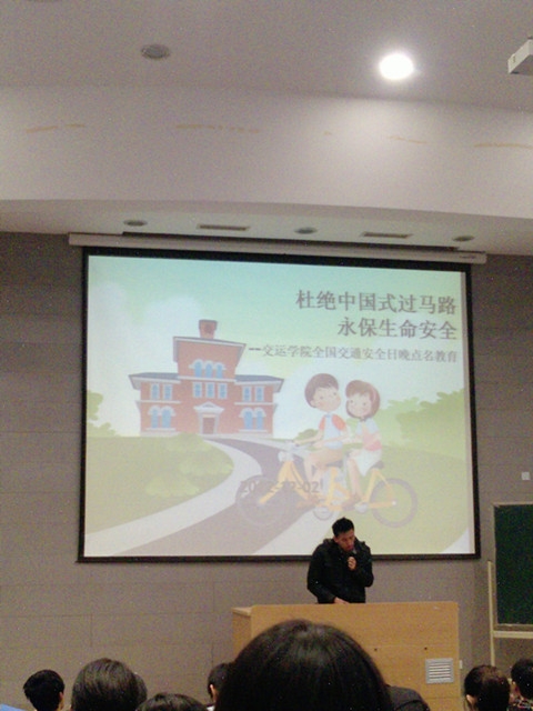 2012年12月2日是全国交通安全日,为了更好地向同学们宣传交通安全教育,交运天博体育 管理系10级在2C101开展了题为“杜绝中国式过马路”的安全教育主题晚点名。晚点名由辅导员郝海光来主持。
