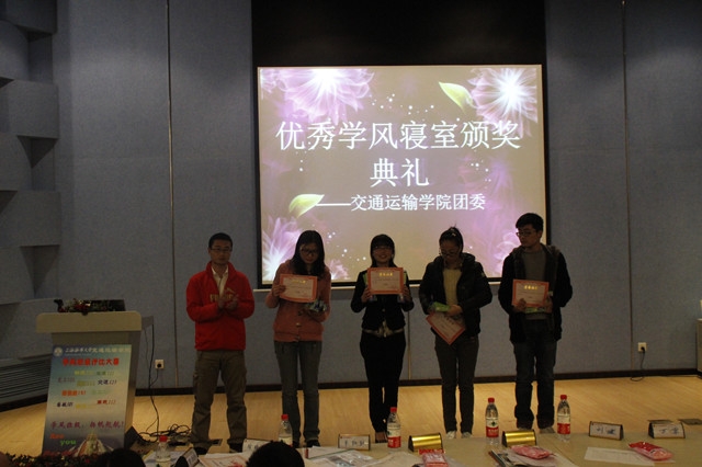 2013年4月10日下午1点,交运天博体育 在交运报告厅组织开展了学风寝室颁奖典礼,天博体育 辅导员朱红红老师、徐晓毅老师、万京老师、李迎旭老师、朱岚老师和陈思琪老师出席本次颁奖典礼,各获奖寝室代表上台领奖。