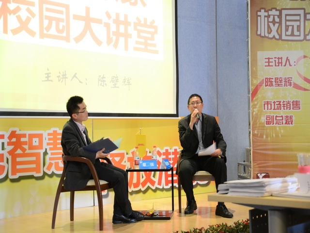 首先,主持人章老师隆重介绍了参加本次活动的嘉宾,并对他们的到来表示热烈欢迎。接下来,主持人章老师与陈壁辉先生进入到了对话访谈环节。陈壁辉先生与在场同学分享了自己十余年从事销售工作的经验,并就如何利用色彩性格学分析客户类型、在客户管理中怎样取得客户信任、销售人员需要注意的细节等问题与主持人进行了探讨。在提问环节中,同学们积极地提问,陈壁辉先生也耐心细致地做出了解答,并寄语同学们:“不管做什么事都要有热情,要开心地做事,这样上班才有意义。尤其是销售这一行,要学会不放弃,只有不放弃才能有机会。”