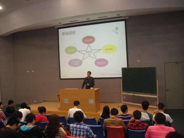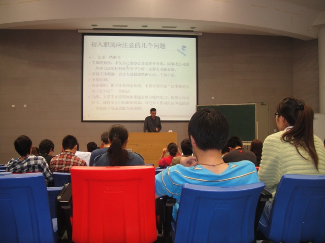 2013年5月12日,“职场适应心理讲座”在教学楼2C101举行,辅导员郝海光担任主讲,管理10的同学参加了此次的讲座。