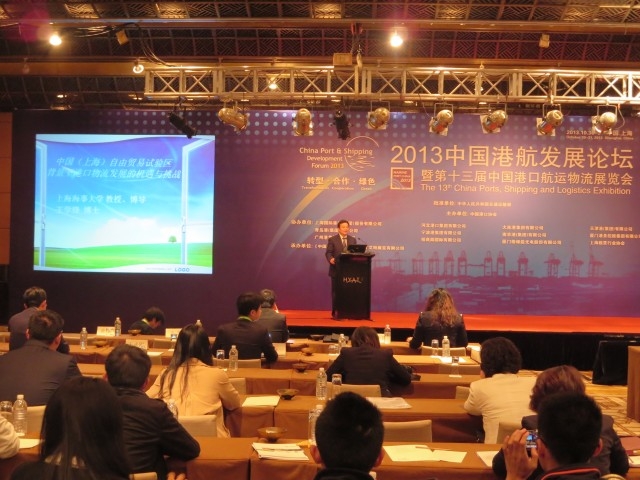 以“转型、合作、绿色”为主题的2013中国港航发展论坛暨第十三届中国港口航运物流展览会于2013年10月30日至31日在上海金茂君悦大酒店举行。原交通运输部副部长徐祖远和港航相关单位领导、专家出席此次论坛,天博体育 教授王学锋老师作了主题为“上海自贸区港航负面清单”的精彩演讲,天博体育 一百多名研究生参加了此次论坛。