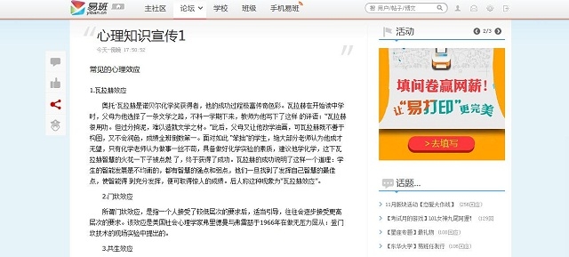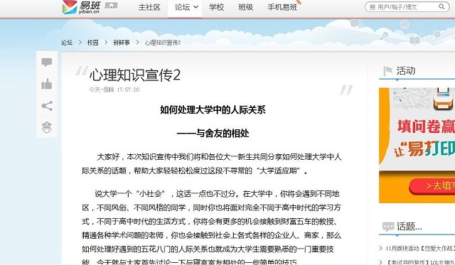 为了宣传大学生心理知识,预防大学生心理问题,11月25日晚开始交运天博体育 于易班平台上开展了首期日常心理知识宣传活动,本次活动覆盖交运天博体育 所有大一新生。
