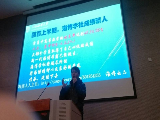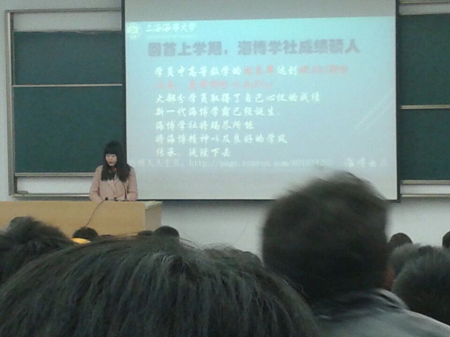 2014年3月2日,在交运天博体育 大一、大二年级的晚点名活动上,海博学社对即将开展的课程进行了宣传。本次活动主要由指导老师朱红红老师组织,海博学社各部门负责协助。
