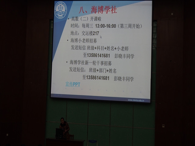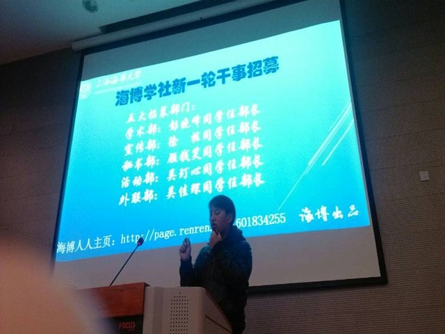 2014年3月2日,在交运天博体育 大一学生的晚点名活动上,海博学社对全院进行了招新宣传。本次活动主要由指导老师朱红红老师组织,海博学社各部门负责协助。