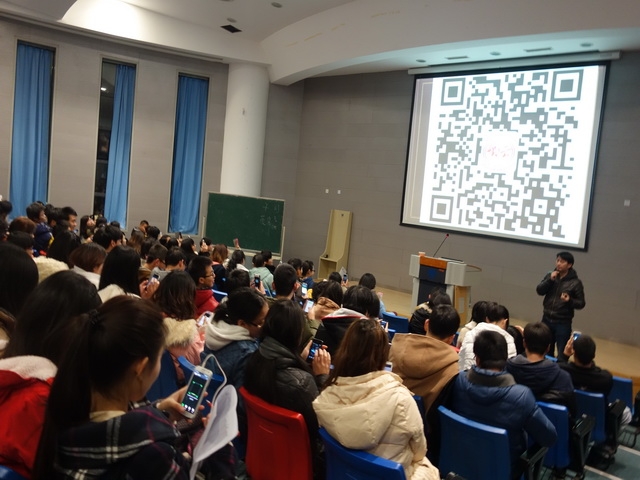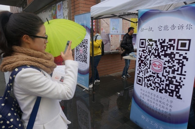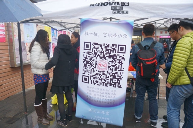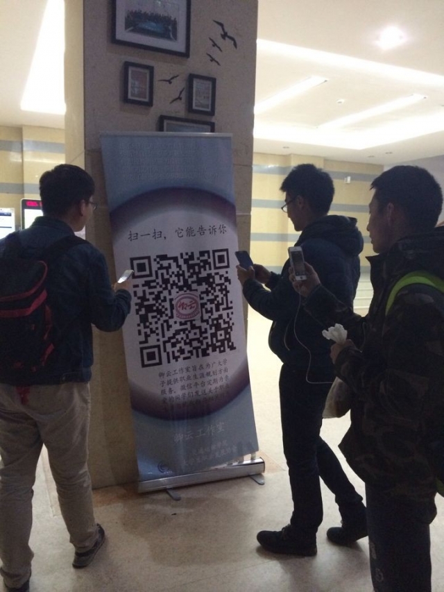 卿云工作室是上海市教委高校职业(生涯)发展教育工作室建设点之一,旨在为广大学子提供职业生涯规划方面服务,并定期为同学们发送关于职业生涯与就业指导等相关信息。为了扩大卿云工作室微信平台的宣传力度,工作室在晚点名进行宣传的同时,交运职协的成员分别在天博体育 大楼、北广、学服、女寝张贴了海报和易拉宝。过往的同学们纷纷拿出了自己的手机,通过扫描二维码的方式关注了卿云工作室微信平台。