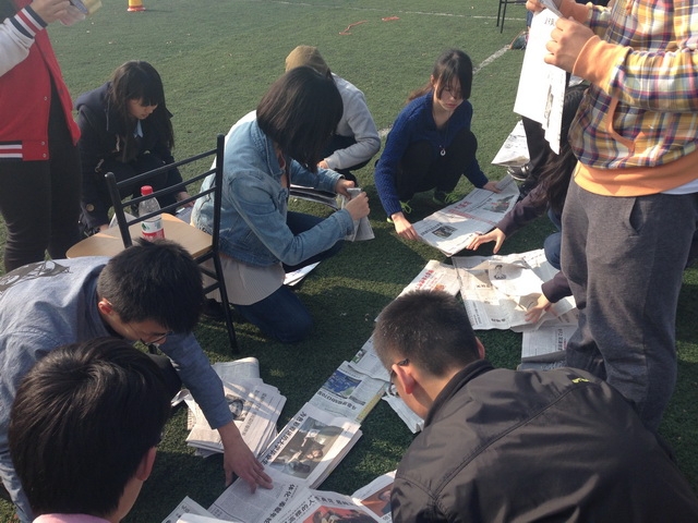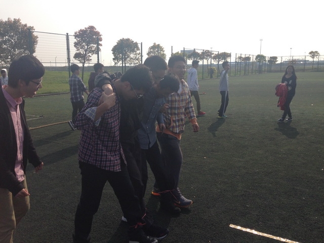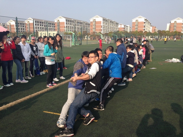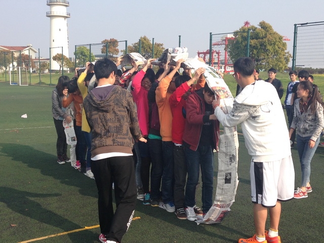 在第一个游戏“蛟龙出海”中,所有班级分别派出了八位同学并分成两组,进行接力式的四人五足走,最终国航135班突破层层挑战摘得本项目桂冠。在第二个游戏“无敌风火轮”中,每班派出了15位同学并需要根据裁判提供的有限材料,在10分钟内做成一个可以行进履带式圆环并行进15米的距离,最终国航133班以速度上压倒性的优势获得了本项目冠军。在最后一个项目,也是最紧张的一个项目“团体拔河”中,每个班派出了10男10女进行了淘汰赛来争夺最后的冠军。在最后的决赛中,刘建老师也以选手的身份参加到了比赛中,让现场气氛达到了高潮。最终,国航134班一路过关斩将获得了最后一个项目的冠军。在活动行将结束之际,所有班级都自发合影留念,为本次素质拓展画上了一个圆满的句号。