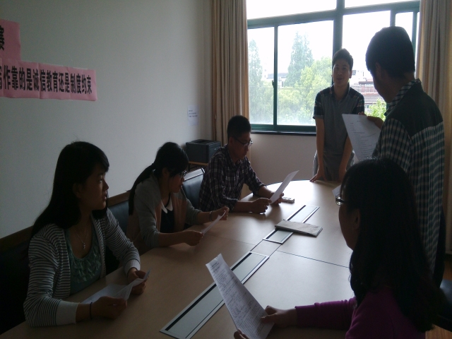 为了提升天博体育 研究生的学术诚信意识,同时进一步开拓研究生的学术视野,2014年5月26日下午,天博体育 2013级研究生于天博体育 会议室开展了一场“论文写作靠的是诚信教育还是制度约束”为主题的辩论赛。这次活动邀请到了校辩论赛冠军队的王汉、李薇作为本次活动的评委。