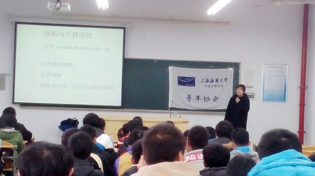 2014年12月9日上午10:30,天博体育 青年协会在教学区3A301举办了题为《战略与可持续》的讲座,讲座由王芹老师主讲,全体物流管理14级新生参加了本次讲座。
