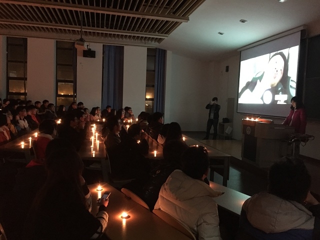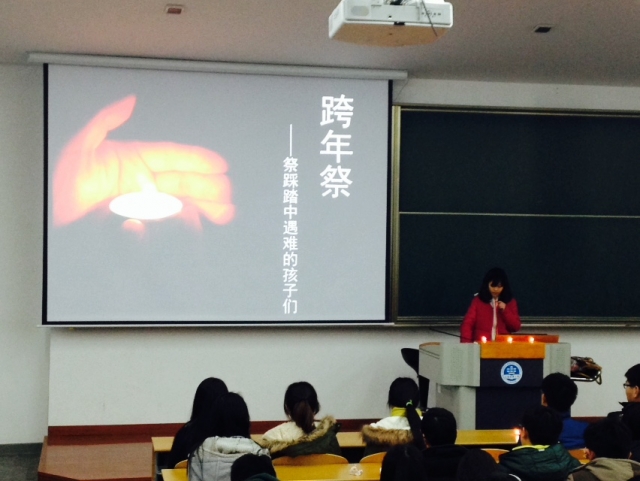 2014年12月31日晚,上海市黄浦区外滩陈毅广场发生群众拥挤踩踏事故,事故中36人死亡,49人受伤,其中大多数为青年。活动一开始,陈祯如老师首先播放了两段视频,分别反映了当天现场的情况和救治医院中的情况。接着,同学们点燃了手中的蜡烛,在陈祯如老师的主持下开始了悼念活动,郭晓琛同学在烛光中朗诵了《跨年祭—祭踩踏中遇难的孩子们》。拥挤的人潮、忙乱的医院、痛苦的家属……这些画面久久萦绕在同学们的脑海之中,同学们的表情非常凝重。朗诵完毕,全体同学默哀一分钟,愿逝者安息,愿生者坚强。悼念活动结束后,熊垟同学组织大家开展了安全教育活动,内容包括如何避免同类事件发生以及如何在踩踏事故中自救等。
