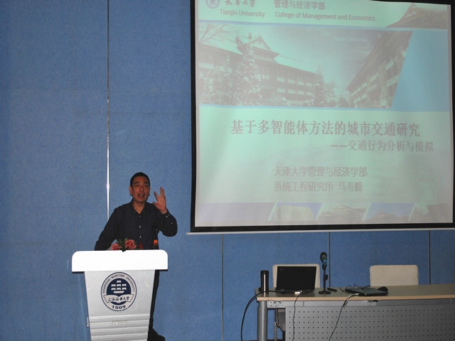 2015年1月14日下午,天博体育 学术报告厅充满了浓浓的学术氛围,天津大学管理与经济学部副主任,系统工程研究所教授,博士生导师马寿峰受邀来到天博体育 ,为天博体育 师生作了题为《基于多智能体方法的城市交通研究——交通行为分析与模拟》的学术报告。