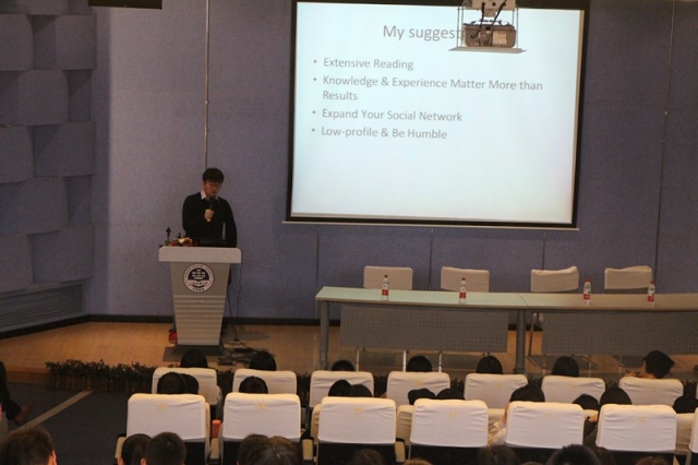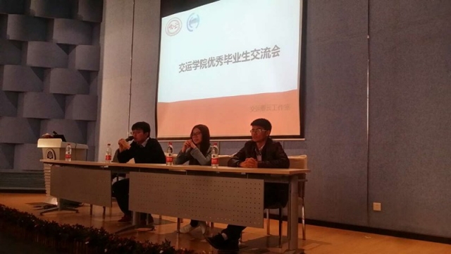 本次交流会邀请到了交运天博体育 三名优秀毕业生,分别是考上北京交通大学硕士研究生的秦晶晶同学、保送南京大学硕士研究生的张梦君同学和申请上卡斯商天博体育 管经纬同学。他们依次上台讲述了他们的个人大学经历,重点介绍一路走来的人生体悟并且在学习方面给在场学弟学妹提出了很多宝贵的建议。担当主持人的刘建老师在每位优秀毕业生演讲完后都作了简短的总结。最后是互动环节,到场的同学借此良机纷纷提出了自己有关学业方面的问题,优秀毕业生们都尽其所能给满意的答复。