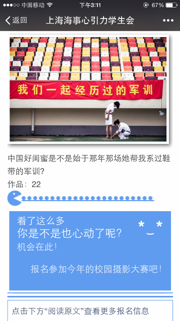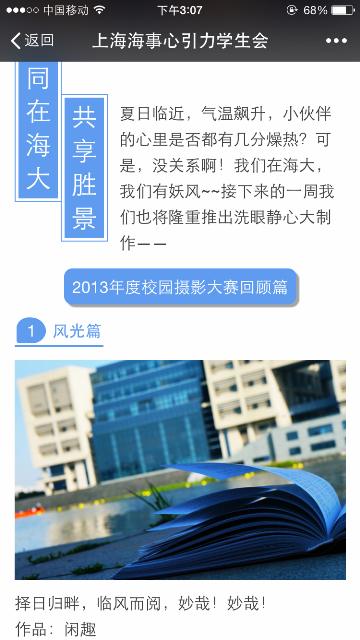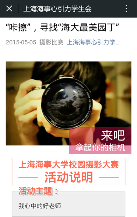 在活动的推广上,心引力学生会不仅制作海报在北广张贴宣传,同时也利用晚点名在不同的天博体育 进行了宣传介绍。近期,在心引力微信公众号上也开展了以“朝花夕拾,写意海大”为主题的往届优秀获奖作品的宣传,充分响应“四进四信”之“进网络”的号召,运用网络平台,结合时代发展趋势,吸引更多学生参与进来。