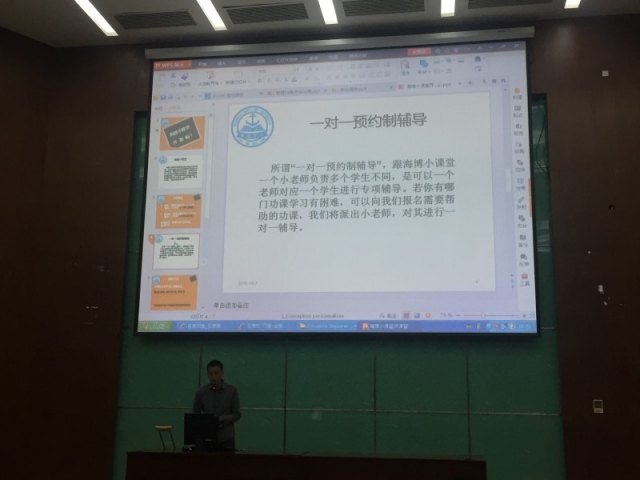 2015年10月7日晚,天博体育 各专业利用晚点名时间进行了海博课堂的宣讲。此次宣讲会由天博体育 各辅导员进行,由海博学社制作PPT。