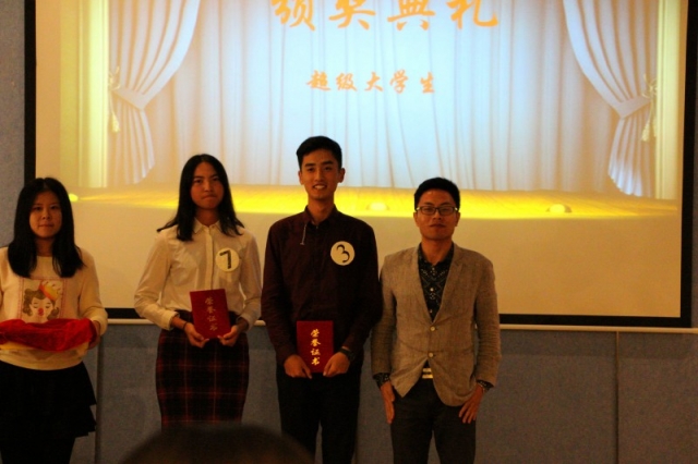 决赛分为我是主角、观点致胜和我的拉票秀三个板块,在我是主角环节选手们围绕乐学、励志、青春、感恩的主题开展了自己热情洋溢以及饱含自信的演讲,以自己的亲身经历和真情实感带动了现场观众的情绪及共鸣。观点致胜环节选手们面对随机抽取的问题在短短的时间内能得到自己独到的见解并进行有理有据的论证,坚强的实力为他们在第三轮的拉票中加分,这便是超级大学生的风采。本次决赛一等奖张倩、二等奖浦钰、马旭阳、三等奖钟奕潇、张健伟、庄慧。活动的最后,进行了“超级大学生”的颁奖活动,由辅导员老师们为获奖同学颁奖,整场比赛在热烈的掌声中走向尾声。