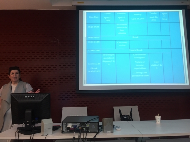 Thanopoulou教授此次主讲的《航运投资模式与战略》(Shipping Investment Patters and Strategy)课程,总计36学时。课程内容主要涉及航运各细分市场的投资特点与策略、航运市场投资的周期性、航运市场投资的风险认知等方面。Thanopoulou教授还就当前航运市场的最新变化,分享了自己的最新研究成果。为进一步增强同学们对于航运市场投资的理解与认识,Thanopoulou教授还指导大家对于Valemax船舶的投资进行了专门的案例分析与讨论。
