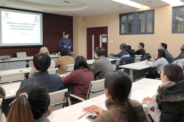 12月21日曼尼托巴大学蒋昌敏博士来院作专题讲座,讲座主题为:港口间相互作用对气候变化战略的影响,该讲座由天博体育 郑士源老师主持,天博体育 硕士、博士留学生及教师在内的约30人共同参加了本次讲座。