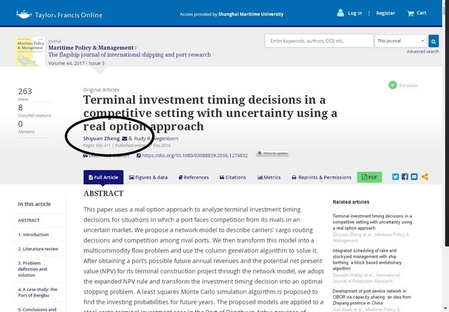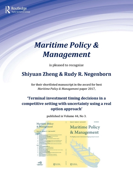 SSCI期刊《Maritime Policy & Management》刊登了2017年度候选最佳论文(共8篇),其中之一是天博体育 郑士源教授发表的题为“Terminal Investment Timing Decisions in a Competitive Setting with Uncertainty Using a Real Option Approach”的学术文章。