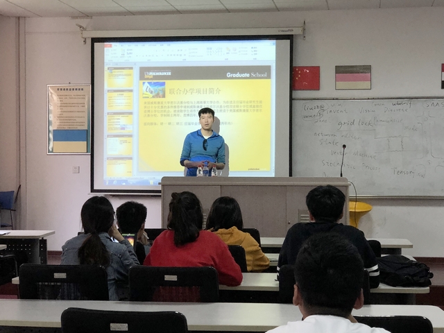 第二个环节,刘教授针对天博体育 与美国威斯康星大学密尔沃基分校研究生双学位联合培养项目,从报名要求、申请流程、课程及费用、职业规划等方面进行了详细介绍,鼓励同学们积极参与该项目,抓住机会,开拓视野,提升自我。