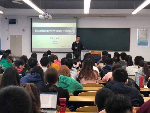2018年11月14日下午1:30, 同济大学梁哲教授来访天博体育 ,并在教学楼2B205教室作了题为“航空运营管理中的大规模组合优化问题”的学术报告。此次报告以航空运营管理优化为主题,吸引了包括学生和教师在内的百余人前来分享他的研究成果。