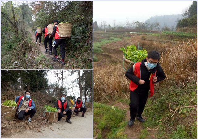 摘好了儿菜,接下来我们就要把儿菜背到停在几百米外公路的货车上去。在崎岖不平的田间土路和村道路上,我第一次用背篓背70多斤的儿菜。说实话,确实不太好背。由于我以前缺少锻炼,经验缺乏;再加上疫情防控要求,人人必须佩戴口罩,背菜爬坡压得我喘不过起来,眼镜也被雾气笼罩,视线模糊不清。但志愿者是一个团结协作的集体,一起做志愿的谭志鹏同学看到我有点吃力,很快跑到我的身后托着背篓,我也给前面的同学搭把手。就这样,我们每一个志愿者都相互帮扶,咬紧牙,一趟一趟的坚持,最后把货车塞得满满。看着满满一车蔬菜,再看到大爷舒展的眉头,我的心暖暖的,再累也值了。