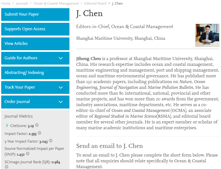 OCMA期刊是爱思唯尔旗下国际海洋领域的老牌知名期刊,JCR Q1区SCI期刊,2018年影响因子为2.595,近5年平均影响因子为3.043,最新CiteScore评分3.19。陈继红教授将重点负责该期刊国际海洋海事规划与管理等领域论文;Bruce Glavovic和Tim Smith教授将重点负责该期刊国际海洋海岸生态与环境等领域论文。