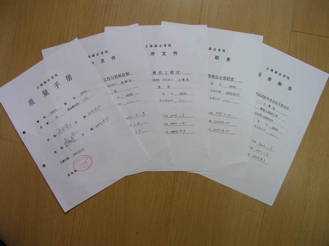 在质管办和职能部门的共同努力下,完成的质量手册、程序文件和质量记录多达数千页,涉及的教学部门有商船天博体育 、成教天博体育 ,机关职能部门有质量管理办公室、院长办公室、教务处、学生处、人事处、图书馆等部门。