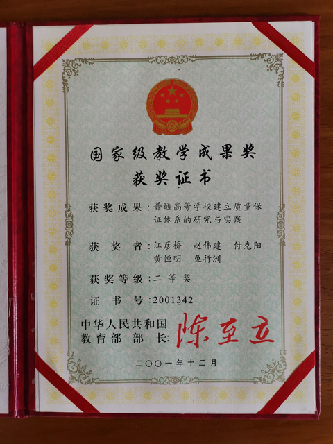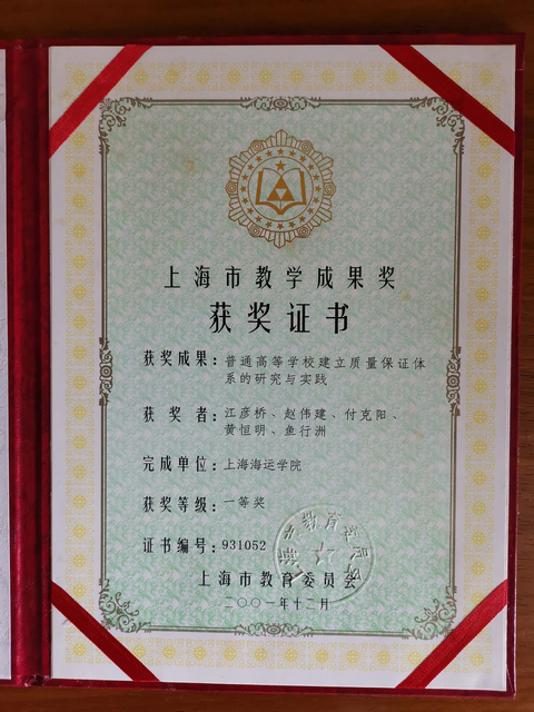 1999年,以江彦桥为组长,付克阳、黄恒明、鱼行洲和我(5人)组成课题组,申请到上海市教育科学研究项目,经过近一年的辛勤工作及探索,“普通高等天博体育 建立教学质量保证体系的研究与实践”终于结题,并形成文字,印制成册。2001年,“普通高等天博体育 建立教学质量保证体系的研究与实践”研究项目获得了上海市优秀教学成果一等奖。同年,获得全国优秀教育成果奖二等奖,此课题也成为上海海运天博体育 历史上获得国家级教学成果奖项的零突破。