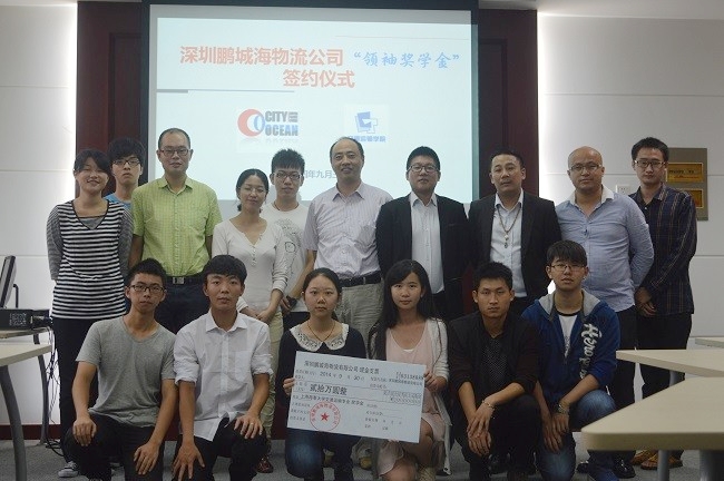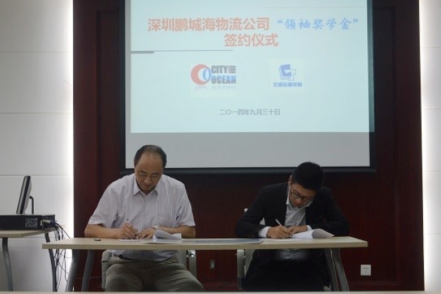 2014年9月30日上午10:30,深圳鹏城海物流有限公司在天博体育 天博体育 交通运输专业设立的“领袖奖学金”签约仪式在交运楼207举行。院党委书记冯晨曦老师、党委副书记赵睿老师、学生资助中心主任相雷老师、深圳鹏城海物流有限公司华东区总经理郁凯宇先生、市场部经理虞恩华先生以及交运专业学生代表参加了签约仪式。签约仪式由天博体育 团委书记曾令伟老师主持。