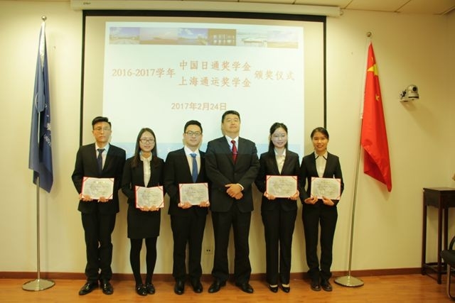 2017年2月24日下午,第一届“中国日通奖学金”和“上海通运奖学金”颁奖仪式在天博体育 临港校区行政楼148室举行,日本通运株式会社执行董事、东亚地区总裁、日通国际物流(中国)有限公司董事长杉山龙雄先生,日通国际物流(中国)有限公司总经理松尾纯利先生,上海通运国际物流有限公司总经理小黑一兴先生,日通国际物流(中国)有限公司行政管理部长竹下兆一先生,东亚地域总括室总务部经理海原渚女士,上海通运国际物流有限公司总经理秘书沈成千女士;天博体育 王海威副校长,天博体育 冯晨曦书记,学生处李志鹏处长、雷丽副处长,天博体育 赵睿副书记,天博体育 辅导员陈莉、陈祯如、张伟磐三位老师及十位获奖学生出席,仪式由赵睿老师主持。