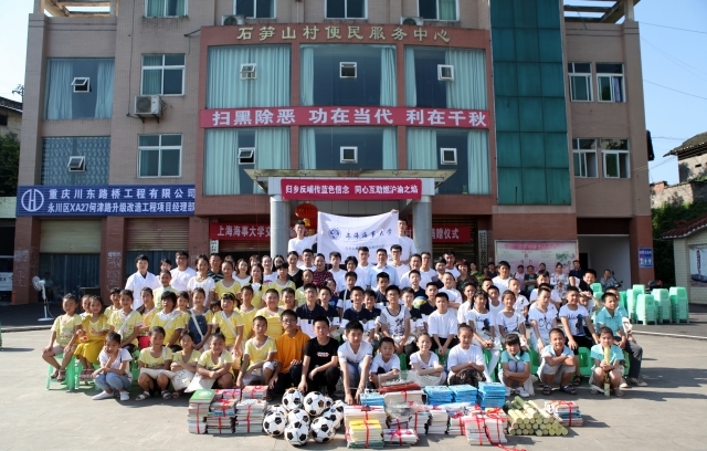 精彩的发言结束后,在热烈的掌声中,双方进行“书心海角”图书角授牌仪式。随后,由队员分别代表上海市闵行区七宝镇教育发展委员会、上海市羽毛球协会和上海海事局向石笋山村委捐赠图书、文具、运动用品、衣物等物资。此次共捐赠近千本册图书,百余套文具,三件船模及二十五套体育用品。