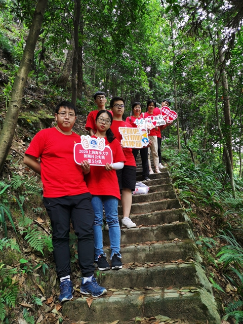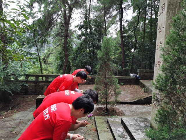 随后,实践队前往位于重庆南山凉风垭森林公园内的周均时墓。沿着弯弯绕绕的青石板路行走了20余分钟,终于寻到了周均时校长的墓。在绿树林荫之下,斑驳的阳光投射到墓碑之上,地上的松针与青苔诉说着这里光阴的故事。在墓前矗立着一块诉说周均时老校长生平功绩的石碑,扫去石碑上的落叶,可以清晰看到上面记载着的周均时老校长半世纪的人生中为国家、为民族所做的贡献。全体实践队员为周均时老校长献上鲜花,送上我们的祝福。据资料显示这是周均时老校长的弟弟在解放之后将周均时的墓地迁入这个地方,安葬在此处。